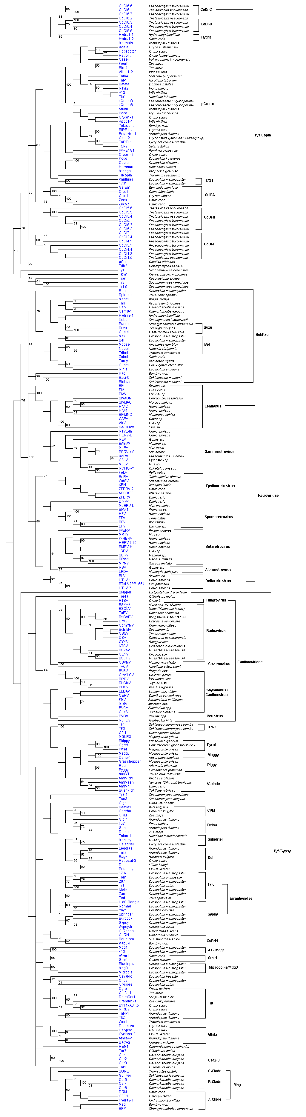 Llorens, C., Futami, R., Covelli, L., Dominguez-Escriba, L., Viu, J.M., Tamarit, D., Aguilar-Rodriguez, J. Vicente-Ripolles, M., Fuster, G., Bernet, G.P., Maumus, F., Munoz-Pomer, A., Sempere, J.M., LaTorre, A., Moya, A. (2011) The Gypsy Database (GyDB) of Mobile Genetic Elements: Release 2.0 Nucleic Acids Research (NARESE) 39 (suppl 1): D70-D74 doi: 10.1093/nar/gkq1061