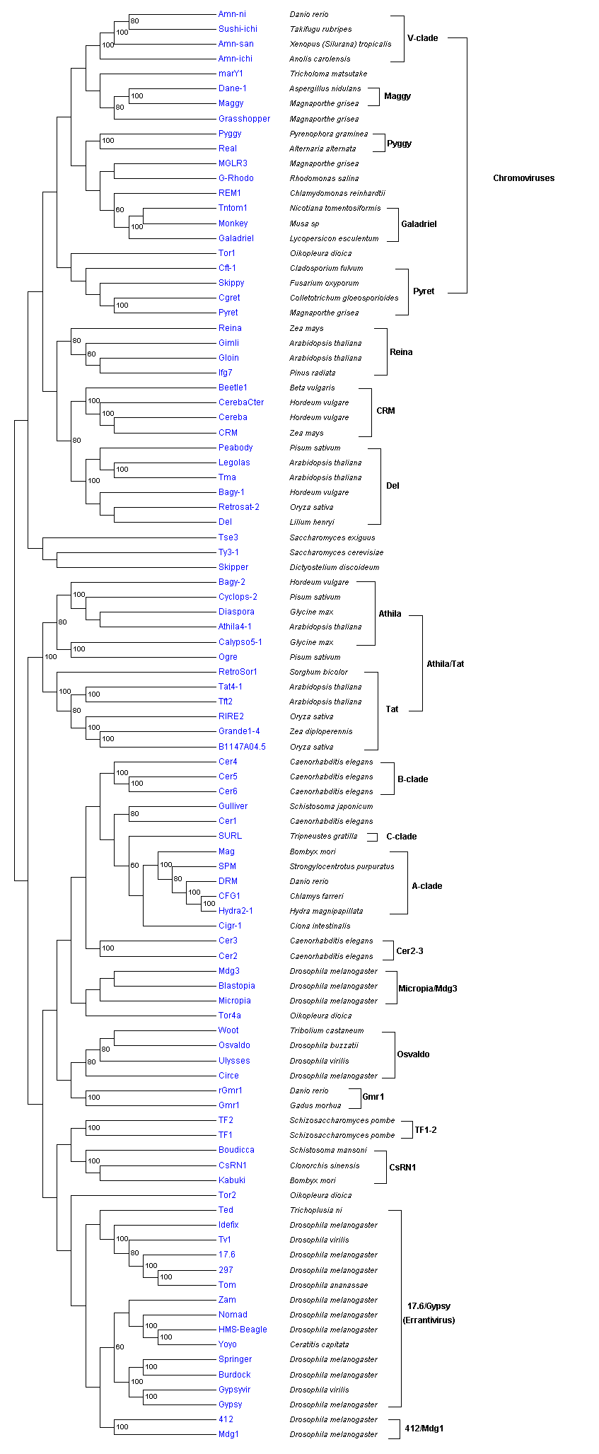 Llorens, C., Futami, R., Covelli, L., Dominguez-Escriba, L., Viu, J.M., Tamarit, D., Aguilar-Rodriguez, J. Vicente-Ripolles, M., Fuster, G., Bernet, G.P., Maumus, F., Munoz-Pomer, A., Sempere, J.M., LaTorre, A., Moya, A. (2011) The Gypsy Database (GyDB) of Mobile Genetic Elements: Release 2.0 Nucleic Acids Research (NARESE) 39 (suppl 1): D70-D74 doi: 10.1093/nar/gkq1061