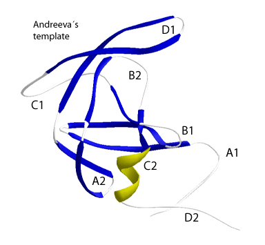 The "DTG/ILG" template is the primary structure phenotype of a structural supersecondary structure, called "Andreeva’s" template (Andreeva 1991) that was previously used to describe pepsins and retropepsin. The "Andreeva’s" template is constituted by the following structural elements: an N-terminal loop (A1), a loop containing the catalytic motif (B1), an α-helix (C1) usually not preserved in retropepsins, a β-hairpin loop (D1), a hairpin loop (A2), a wide loop (B2), an α-helix (C2) towards C-terminal, and a loop (D2), which in empirically characterized retropepsins is substituted by a strand or a helical turn (Wlodawer and Gustchina 2000; Dunn et al. 2002). These elements are responsible of keep both function and three-dimensional (3D) structure in characterized retropepsins and other characterized clan AA peptidases (Wlodawer and Gustchina 2000; Dunn et al. 2002). It has also recently suggested that the structure of the HIV-1 (see the figure below) and other clan AA PRs have a flexibility-assisted mechanism evolutionarily preserved to favor the reactive conformation of the enzyme (Piana, Carloni, and Rothlisberger 2002; Piana, Carloni, and Parrinello 2002; Perryman, Lin, and McCammon 2004).