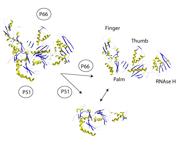 At the three-dimensional (3D) structure level the RT codified by the HIV-1 retrovirus is an asymmetrical heterodimer composed of two subunits of 66 and 51 kDa, p66 and p51 respectively. P66 can be divided into five structural subdomains consisting in the RNaseH domain and four subdomains which, due to their similarity to a human right hand, are referred to as fingers, palm, thumb, and connection (Kohlstaedt et al. 1992). P51 is a p-66´ derivative after proteolytic processing and excision of the RNase H (Di Marzo et al. 1986; Wondrak et al. 1986; Lightfoote et al. 1986).