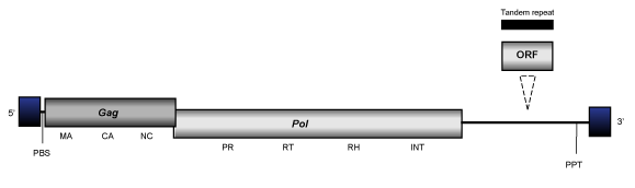 Gypsy is a clade collecting both retroviruses and LTR retrotransposons. They usually show genomes of 6-7 Kb and LTRs of 200-400 nts in size. Their internal region usually is arranged in two or three ORFs (depending if they include or not an env gene) flanked by a PBS normally complementary to a tRNALys, and a PPT downstream and upstream to the 5´and 3´LTRs, respectively.